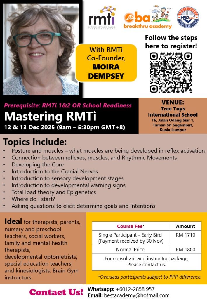 Rhythmic Movement Training – Mastering RMTi (80109) Current Status Not Enrolled Enroll in this course to get access Price RM 1800 (Early Bird RM 1710) Get Started Take this Course How to sign-up for this class: Signing up a Rhythmic Movement Training class by Breakthru Academy involves registering at both Empwr2u.com (this site) and Rhythmic Movement website. Here are the steps.: 1. Create an account (if you do not have one yet) and sign-up a class here at empwr2u.com by paying the class training fee. (look out for the “Log-in to enroll” or “Take this course” at top right corner of this page.2. Create an account (if you do not have one yet) at rhythmicmovement.org.3. Pay the RMT royalty fee at Mastering RMTi – Moira Dempsey – December 12th, 2025 – Rhythmic Movement Training International (RMTi).4. Attend your class.5. To download any class material (if any, you may ask your instructor), log-in to empwr2u.com and locate your class from “My Classes” menu.6. Get your certificate at rhythmicmovement.org upon completing your class. You will only get your certificate after your instructor mark your attendance on the website. Course Content Lesson You don't currently have access to this content